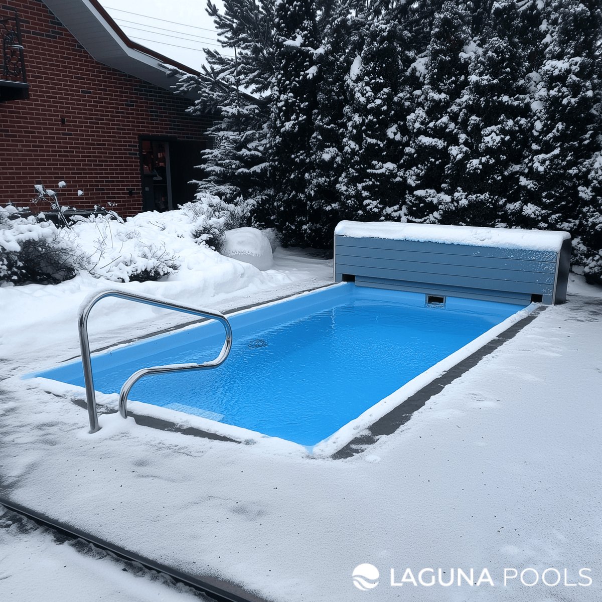 Композитный бассейн с металлическим поручнем и открытым покрытием на заснеженной территории частного дома.